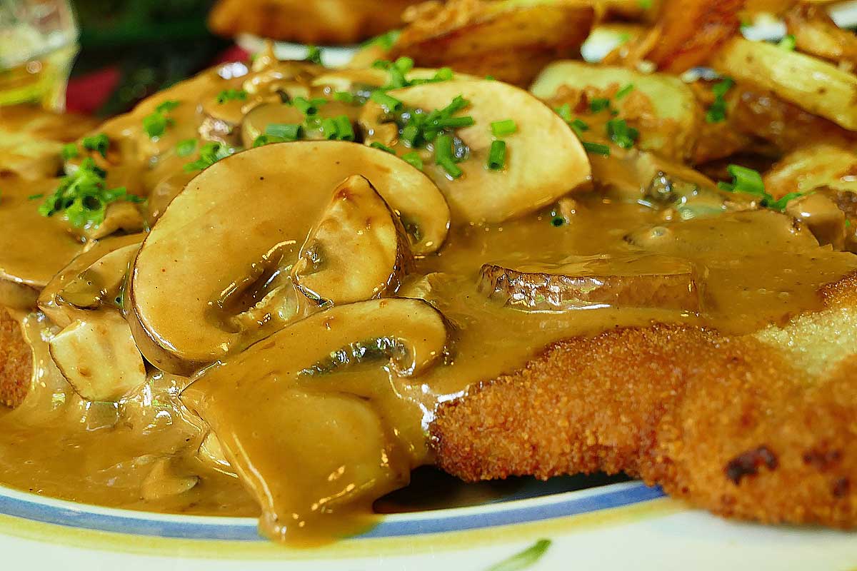 Gebratenes Schnitzel vom Strohschwein mit Champignonrahm oder Sambal- Hollandaise, dazu Bratkartoffeln und Salat der Saison